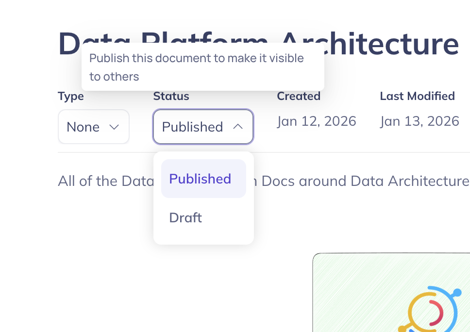 - Control visibility — Publish to share with your organization and AI agents, or keep as draft